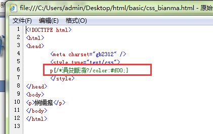 <!DOCTYPE html> <html> <head> <meta charset="gb2312" /> <style type="text/css"> p{/*三漢字*/color:#f00;} </style> </head> <body> <p>測試</p> </body> </html>